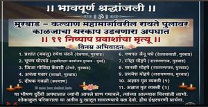 मुरबाड – कल्याण महामार्गावरील रायते पुलावर काळजाचा थरकाप उडवणारा अपघातात ११  निष्पास प्रवाशांचा मृत्यू झाला. त्यात तीन महिलांसह ९ इस्मानचा समावेश आहे. मृत्यू झालेल्यांमध्ये १). प्रशांत (बबलू) रुपेश चंदने (देवगाव, मुरबाड),२) गणपत जैनू मधे (देवराळवाडी, मुरबाड),३) भूषण घोरपडे (तहसीलदार कार्यालय मुरबाड – मुंबई),४) स्नेहा मोहपे (नारायणगाव, मुरबाड),५) जिजा गोविंदा केंबारी (टेंभरे, मुरबाड),६) मानसी मोहपे (नारायणगाव, मुरबाड),७)अनंता पवार (साखरे, मुरबाड),८) प्रथमेश मोहपे (नारायणगाव, मुरबाड),९) दीपक गवळी (कल्याण),१०) अज्ञात मृत व्यक्ती ,११) अज्ञात मृत व्यक्ती या ११ जणांचा समावेश असल्याचे पोलिसांनी सांगितले आहे. अद्याप दोन जणांची ओळख पटली नाही.  या प्रकारे टिटवाळा पोलीस ठाण्यात अज्ञात सिमेंट मिक्सर गाडी चालकाविरुद्ध गुन्हा दाखल करण्यात आला असून अधिक तपास पोलीस निरीक्षक एडके करीत आहेत.