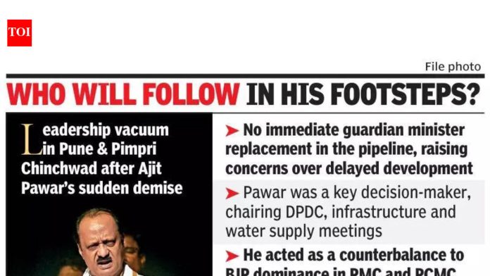पुणे : राष्ट्रवादी काँग्रेसचे अध्यक्ष अजित पवार यांच्या बुधवारी झालेल्या आकस्मिक निधनाने पुणे आणि पिंपरी चिंचवडमधील राजकीय नेतृत्वाची पोकळी निर्माण झाली आहे. पालकमंत्र्यांची तातडीने बदली न झाल्याने विकास प्रकल्पांची गती कायम ठेवणे प्रशासन आणि पक्षांसमोर आव्हान असेल.अजित पवार यांनी पदावर असताना अनेक प्रकल्प राबवले. शिवाय, पुणे महानगरपालिका (PMC) आणि पिंपरी चिंचवड महानगरपालिका (PCMC) मध्ये भाजपच्या वाढत्या वर्चस्वासाठी ते मुख्य आव्हान होते.