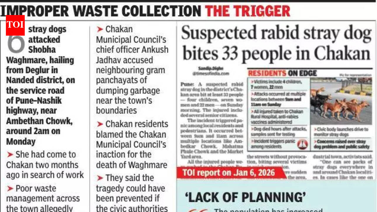 पपुणे : औद्योगिकनगरीत सोमवारी पहाटे एका महिलेचा मृत्यू झाल्याचा वारंवार इशारा देऊनही चाकण नगरपरिषदेच्या भटक्या कुत्र्यांवर कारवाई होत नसल्याचा आरोप रहिवासी आणि कार्यकर्त्यांनी केला.रहिवाशांनी असा दावा केला की या वर्षाच्या सुरुवातीला एका संशयित भ्याड कुत्र्याने अनेकांना चावल्यानंतर नागरी अधिकाऱ्यांनी कठोर उपाययोजना केल्या असत्या तर ही शोकांतिका टाळता आली असती. TOI ने 6 जानेवारी 2026 च्या आवृत्तीत या घटनेचा अहवाल प्रकाशित केला होता.चाकणमधील कार्यकर्ते मयूर मुंगसे म्हणाले, “एक संशयित रेबीज-संक्रमित कुत्र्याने 5 जानेवारी रोजी शहरातील किमान 33 लोकांना चावा घेतला होता. हा अधिकाऱ्यांसाठी एक गंभीर इशारा होता. त्यांनी योग्य प्रतिबंधात्मक उपाययोजना केल्या असत्या तर आज ही निष्पाप महिला जिवंत असती,” असे चाकणमधील कार्यकर्ते मयूर मुंगसे यांनी सांगितले.नांदेड जिल्ह्यातील देगलूर येथील शोभा वाघमारे यांच्यावर सोमवारी पहाटे २ वाजण्याच्या सुमारास पुणे-नाशिक महामार्गावरील सर्व्हिस रोडवर भटक्या कुत्र्याने केलेल्या हल्ल्याने चाकणमधील भटक्या कुत्र्यांचे व्यवस्थापन आणि कचराकोंडी पुन्हा एकदा चव्हाट्यावर आली.“या महिलेच्या मृत्यूला जबाबदार कोण? नगरपरिषदेचे अधिकारी जबाबदारीतून सुटू शकत नाहीत. रहिवासी भीतीने जगत आहेत, तर अधिकारी सबबी सांगत आहेत,” मुंगसे म्हणाले.आणखी एक कार्यकर्ते आणि वकील, महेश भिवरे म्हणाले की, संपूर्ण शहरातील खराब कचरा व्यवस्थापनामुळे मोठ्या प्रमाणात भटकी कुत्री चाकणमध्ये येतात. “जवळजवळ प्रत्येक कोपऱ्यावर कचऱ्याचे ढीग दिसतात. हे उघडे डंपिंग स्पॉट भटक्या कुत्र्यांसाठी अन्नाचे ठिकाण बनले आहेत. जर नगरपरिषद मूलभूत स्वच्छता सुनिश्चित करू शकत नसेल, तर कुत्र्यांची संख्या नियंत्रित करण्याची अपेक्षा कशी करू शकते?” भिवरे म्हणाले.ते म्हणाले की, आठवडी बाजारादरम्यान ही समस्या गंभीर झाली, जेव्हा कृषी उत्पन्न बाजार समिती (APMC) बाजारात भाजीपाला आणि इतर माल विकण्यासाठी खेड तालुक्यातील ग्रामस्थ मोठ्या संख्येने चाकणला येतात. “चाकण हे केवळ एक औद्योगिक शहर नाही, तर एक पारंपारिक बाजारपेठही आहे. दर आठवड्याला हजारो लोक याला भेट देतात. अशा गर्दीच्या ठिकाणी भटके कुत्रे आक्रमकपणे फिरतात तेव्हा सार्वजनिक सुरक्षेचा गंभीर प्रश्न बनतो,” भिवरे म्हणाले.चाकण नगरपरिषदेच्या अधिकाऱ्यांनी त्यांच्या बचावात सांगितले की, जानेवारीच्या घटनेनंतर त्यांनी भटक्या कुत्र्यांचे लसीकरण मोहीम अधिक तीव्र केली आहे. मुख्याधिकारी अंकुश जाधव म्हणाले, “गेल्या काही आठवड्यात आम्ही सुमारे 600 भटक्या कुत्र्यांचे लसीकरण केले आहे. परिषद सुमारे 100 कुत्रे ठेवण्याची क्षमता असलेले न