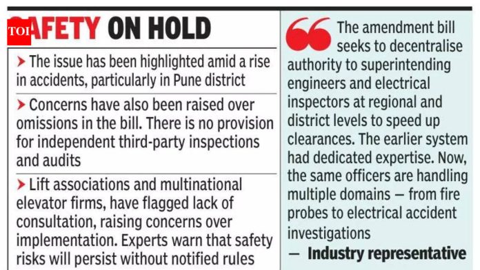 पुणे: महाराष्ट्र लिफ्ट्स, एस्केलेटर आणि मुव्हिंग वॉकवे कायदा, 2017, कार्यान्वित करण्याच्या नियमांच्या विलंबामुळे मंजूर होऊन नऊ वर्षे उलटूनही प्रलंबित आहे, जरी लिफ्टशी संबंधित अपघातांमुळे राज्यभरात तपासणी आणि अंमलबजावणीमधील तफावत दिसून येते, असे नागरिकांच्या गटांनी सांगितले.राज्याने अलीकडेच लिफ्ट्स, एस्केलेटर आणि मूव्हिंग वॉक (सुधारणा) विधेयक, 2026 सादर केल्यामुळे या समस्येची निकड निर्माण झाली आहे, जे अधिकारांचे विकेंद्रीकरण प्रस्तावित करते. मंत्रालयाच्या अधिकाऱ्यांनी सांगितले की, “कायद्यातील कोणत्याही सुधारणांमुळे नियमांना आणखी विलंब होईल.अधिकाऱ्यांनी सांगितले की नियम BIS मानकांसह संरेखन, अद्ययावत तांत्रिक वैशिष्ट्ये, फायर इव्हॅक्युएशन प्रोटोकॉल आणि 20 वर्षे लिफ्टचे ऑपरेशनल आयुष्य निश्चित करण्याचा प्रस्ताव देतात. अधिकृत वार्षिक देखभाल कराराद्वारे लिफ्टची देखभाल केली जात नाही अशा प्रकरणांमध्ये गृहनिर्माण संस्थेच्या पदाधिकाऱ्यांवर जबाबदारी निश्चित करण्याचा प्रयत्न केला जातो.वरिष्ठ अधिकाऱ्यांनी सांगितले की, कायदा आणि न्याय विभागाने “कायद्याशी सुसंगत” नसल्यामुळे गेल्या महिन्यात मसुदा नियम परत केला. ऊर्जा विभागाची मंजुरीही प्रलंबित आहे. मंत्रालयाच्या एका अधिकाऱ्याने TOI ला सांगितले की, “नियमांशिवाय कायदा लागू केला जाऊ शकत नाही.”अधिसूचित नियमांच्या अनुपस्थितीत, कालबाह्य झालेल्या बॉम्बे लिफ्ट नियम, 1958 अंतर्गत लिफ्ट ऑपरेशन्स सुरू राहतात, ज्यामध्ये उच्च-स्पीड लिफ्ट, एस्केलेटर आणि फिरणारे वॉकवे किंवा अद्ययावत सुरक्षा प्रोटोकॉल यांसारख्या आधुनिक प्रणालींचा पुरेसा समावेश होत नाही, असे कार्यकर्त्यांनी सांगितले.विशेषत: पुणे जिल्ह्य़ात वाढत्या अपघातांमुळे हा मुद्दा अधोरेखित झाला आहे. चऱ्होलीमध्ये 12 वर्षीय मुलाचा मजल्यांमध्ये अडकून मृत्यू झाला, वाघोलीत सहा प्रवाशांसह लिफ्ट कोसळली, तर पिंपरी-चिंचवडमध्ये लिफ्टच्या दारात मुलाचा हात अडकला. 2024-25 मधील एकाही अपघाताच्या तुलनेत 2025-26 मध्ये जीवघेण्या अपघातांची संख्या 12 वर पोहोचली, असे ऊर्जा विभागाच्या आकडेवारीत म्हटले आहे.तज्ञांनी या प्रवृत्तीचे श्रेय सुमारे 2.1 लाख लिफ्टचा अनुशेष अनिवार्य वार्षिक तपासणी आणि तीव्र मनुष्यबळ टंचाईला दिले. ते म्हणाले की विद्युत निरीक्षक – आता अनेक जबाबदाऱ्या हाताळत आहेत – परवाना आणि नवीन मंजूरींना प्राधान्य द्या – नियमित तपासणीने बॅकसीट घेतले आहे.“प्रणाली प्रतिक्रियात्मक आहे, प्रतिबंधात्मक नाही. तपासणी हा सुरक्षेचा कणा असतो आणि तिथेच बिघाड होतो,” असे एका वरिष्ठ विद्युत सुरक्षा तज्ज्ञाने सांगितले.पुढे, अधिकाऱ्यांनी सांगितले की दुरुस्ती विधेयक प्रादेश