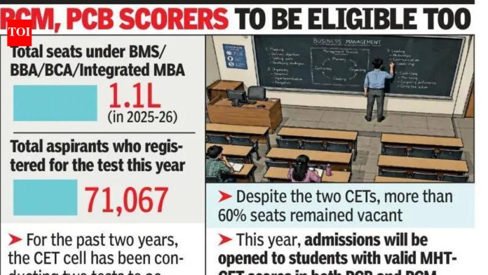 मुंबई: बीएमएस, बीबीए, बीसीए आणि एकात्मिक एमबीए सारख्या अभ्यासक्रमांसाठी सीईटी-आधारित प्रवेश प्रक्रिया सुरू केल्यानंतर दोन वर्षांनी, राज्य सरकारने रिक्त जागा आणि प्रक्रियेतील विलंब या समस्येचे निराकरण करण्यासाठी नियमांमध्ये बदल करण्याचा निर्णय घेतला आहे. PCM किंवा PCB मध्ये वैध MHT-CET स्कोअर असलेले विद्यार्थी देखील आतापासून अर्ज करण्यास पात्र असतील. प्रथम प्राधान्य, तथापि, या अभ्यासक्रमांसाठी (शून्य नसलेल्या गुणांसह) आयोजित समर्पित CET साठी बसलेल्या उमेदवारांना दिले जाईल. उमेदवारांचा हा पूल संपल्यानंतरच उर्वरित जागा पीसीएम आणि पीसीबी स्कोअर असलेल्या विद्यार्थ्यांसाठी खुल्या केल्या जातील. एमएचटी-सीईटी स्कोअर सध्या फक्त राज्यात अभियांत्रिकी, फार्मसी आणि कृषी अभ्यासक्रमांच्या प्रवेशासाठी वापरला जातो. एक-दोन दिवसांत शासन निर्णय जारी होण्याची शक्यता आहे.हे कार्यक्रम ऑल इंडिया कौन्सिल फॉर टेक्निकल एज्युकेशन (AICTE) च्या कक्षेत आणल्यानंतर आणि ‘व्यावसायिक’ अभ्यासक्रम म्हणून वर्गीकृत केल्यानंतर, व्यावसायिक कार्यक्रमांसाठी राज्य नियमांनुसार 2024-25 मध्ये प्रथमच प्रवेश परीक्षा सुरू करण्यात आली. यापूर्वी, प्रवेश फक्त 12वीच्या गुणांवर आधारित होते. याशिवाय, पहिल्याच प्रयत्नात चुकलेल्या विद्यार्थ्यांना सामावून घेण्यासाठी राज्याने दोनदा प्रवेश परीक्षा घेतली. तथापि, यामुळे प्रक्रिया ऑक्टोबरमध्ये ढकलली गेली, ज्या वेळेपर्यंत बहुतेक महाविद्यालयांनी त्यांचे पहिले सत्र पूर्ण केले. त्यामुळे कमी विद्यार्थी प्रतीक्षा करण्यास इच्छुक होते आणि विलंबामुळे महाविद्यालयांचे शैक्षणिक कॅलेंडरही विस्कळीत झाले. त्यानंतर, मागील दोन प्रवेश चक्रांमध्ये, संस्थांमध्ये मोठ्या संख्येने जागा रिक्त होत्या. 2026-27 च्या प्रवेश चक्रासाठी देखील, जवळपास 70,000 उमेदवारांनी सर्व अभ्यासक्रमांमध्ये उपलब्ध असलेल्या एक लाखाहून अधिक जागांसाठी प्रवेश परीक्षेसाठी नोंदणी केली आहे. एका सरकारी अधिकाऱ्याने सांगितले की, विलंब दूर करणे ही प्राथमिक समस्या आहे. “सरकारने घेतलेल्या दोन सीईटीमुळे संपूर्ण प्रक्रियेला विलंब होत आहे. त्यामुळे MHT-CET स्कोअरद्वारेही प्रवेशांना परवानगी देण्याचा निर्णय घेण्यात आला आहे. तथापि, MAH-BBA/BMS/BCA CET मधील वैध स्कोअर असलेल्या उमेदवारांचा पूल संपल्यानंतरच त्यांना परवानगी दिली जाईल. बरोबरी झाल्यास, PCM गुणांसह अधिकृत विद्यार्थ्यांना प्राधान्य दिले जाईल,” असे सांगितले. आणखी एका अधिकाऱ्याने सांगितले की, या निर्णयामुळे एमएचटी-सीईटी इच्छुकांनी अभियांत्रिकी किंवा फार्मसीमध्ये जागा न घेतल्यास त्यांना दुसरा पर्याय मिळेल.यापूर्वी मुंबई विद्यापीठाद्वारे नियंत्रित केलेल्य