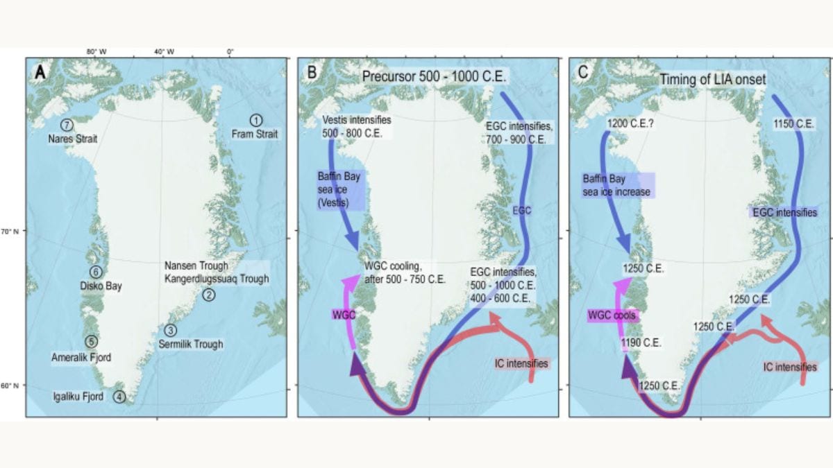 एप्रिल २०२25 मध्ये प्रकाशित झालेल्या एका अभ्यासानुसार, लालिया (उशीरा प्राचीन आइस एज) म्हणून ओळखल्या जाणार्या रहस्यमय ऐतिहासिक हवामान बदलांच्या कालावधीत नवीन अंतर्दृष्टी उपलब्ध आहे. हा कालावधी 536 ते 660 एडी पर्यंत टिकतो. क्रिस्तोफर स्पेंसर, रॉस मिशेल आणि थॉमस गर्नन या त्रिकूटांनी आइसलँडच्या चट्टानात दाखल झालेल्या चुकीच्या ठिकाणी असलेल्या ग्रीनलँड खडकांच्या विश्लेषणाचे वर्णन करणार्या एका जर्नलमध्ये प्रकाशित केले आणि बर्फाच्या युगाच्या या कालावधीशी जोडलेल्या आईसबर्ग क्रियाकलापांचा थेट पुरावा दिला.